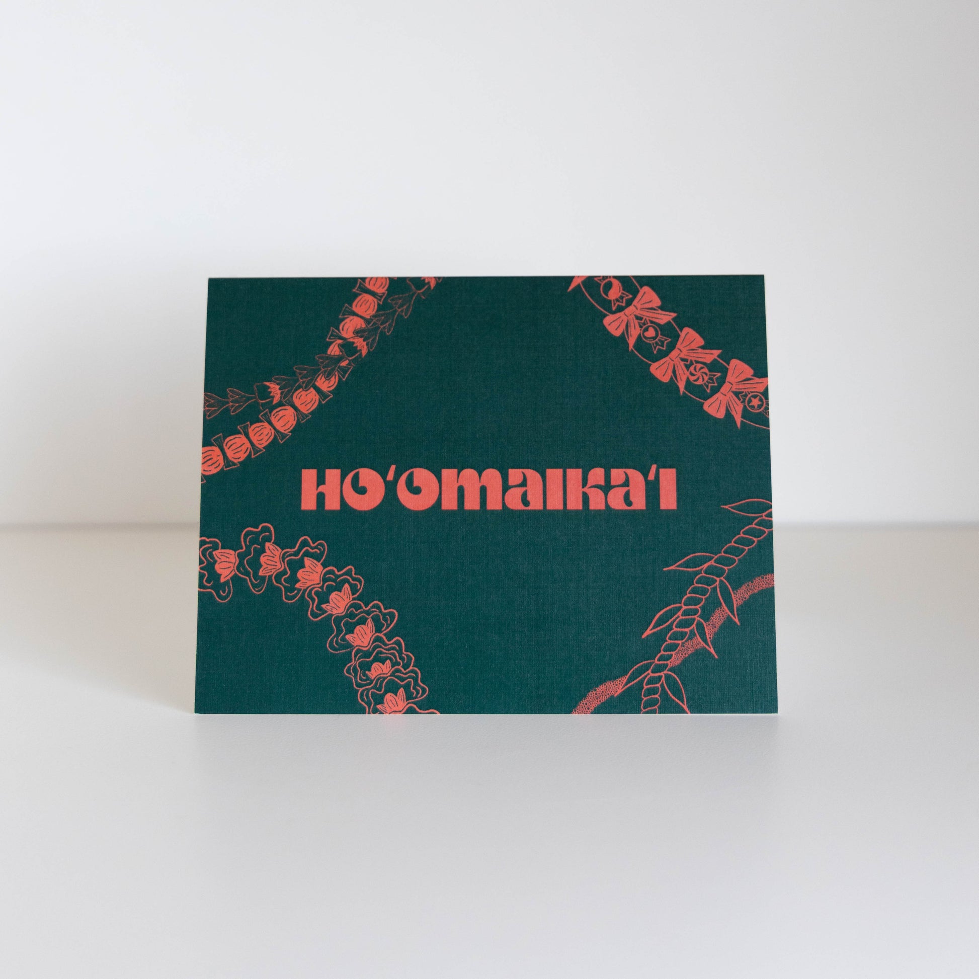 Hoʻomaikaʻi (congratulations) greeting card featuring lei designs inspired by the style of block printed art.