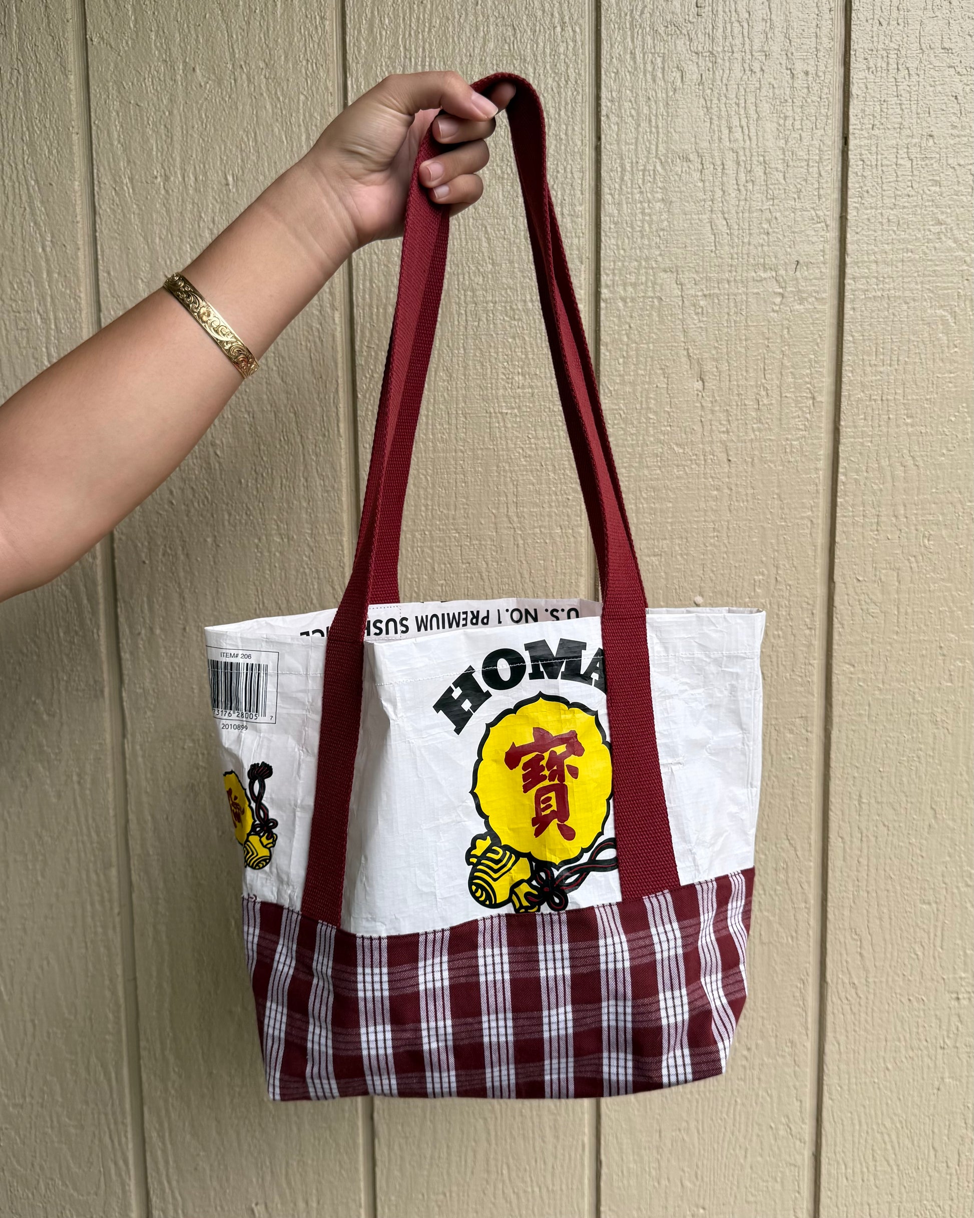 The Kimi Tote, the perfect everyday tote for work, beach or days out with friends. Made from palaka off cuts and recycled rice bags.